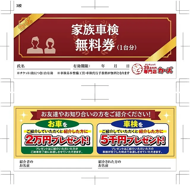 車検を受けた方に限り家族車検クーポンを2枚配布します。